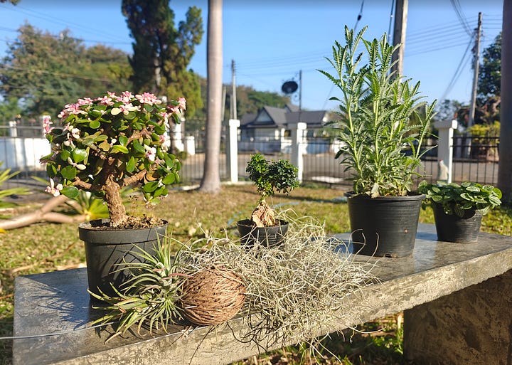 Phase 1: Selection. I researched plants suited to the Thai climate—easy to maintain, compact, visually diverse—then visited Kham Thiang Garden Market in Chiang Mai and handpicked five plants, each distinctly different in appearance and care requirements.