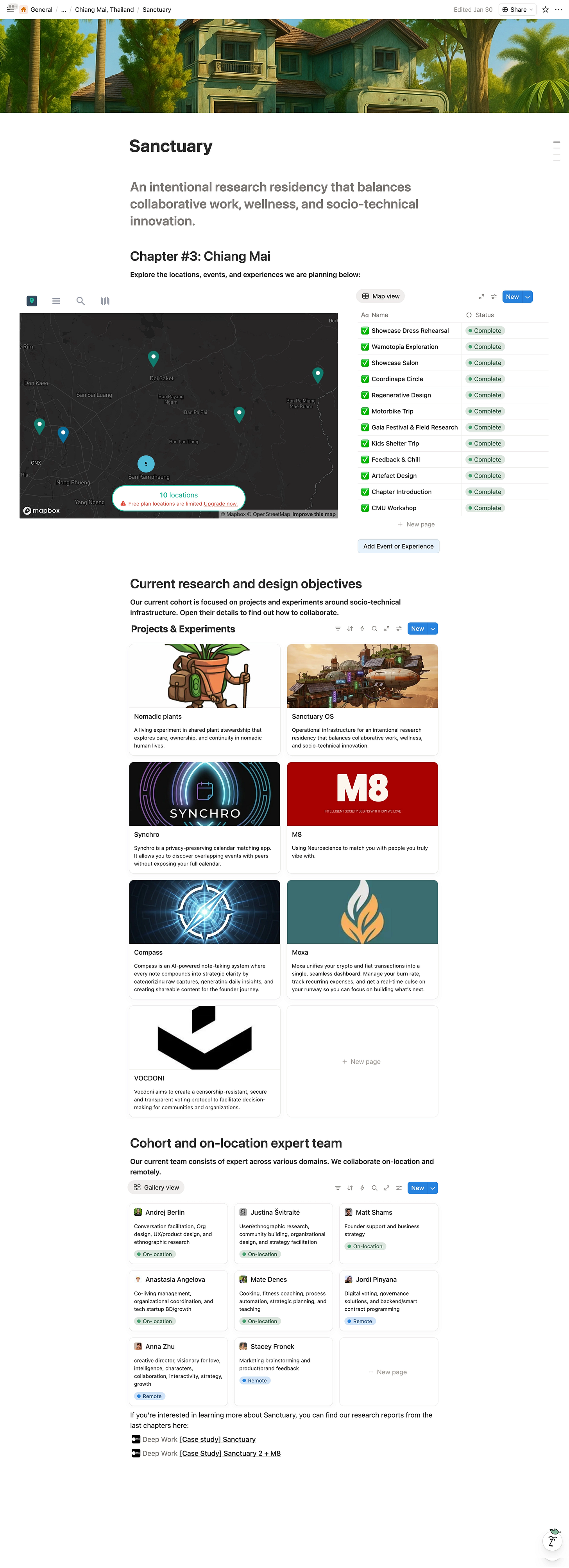 This report outlines Chapter #3 of the Sanctuary. Over three weeks, five experts across different fields shared a house to accelerate progress on their personal projects, learn from each other, and have fun in Chiang Mai.