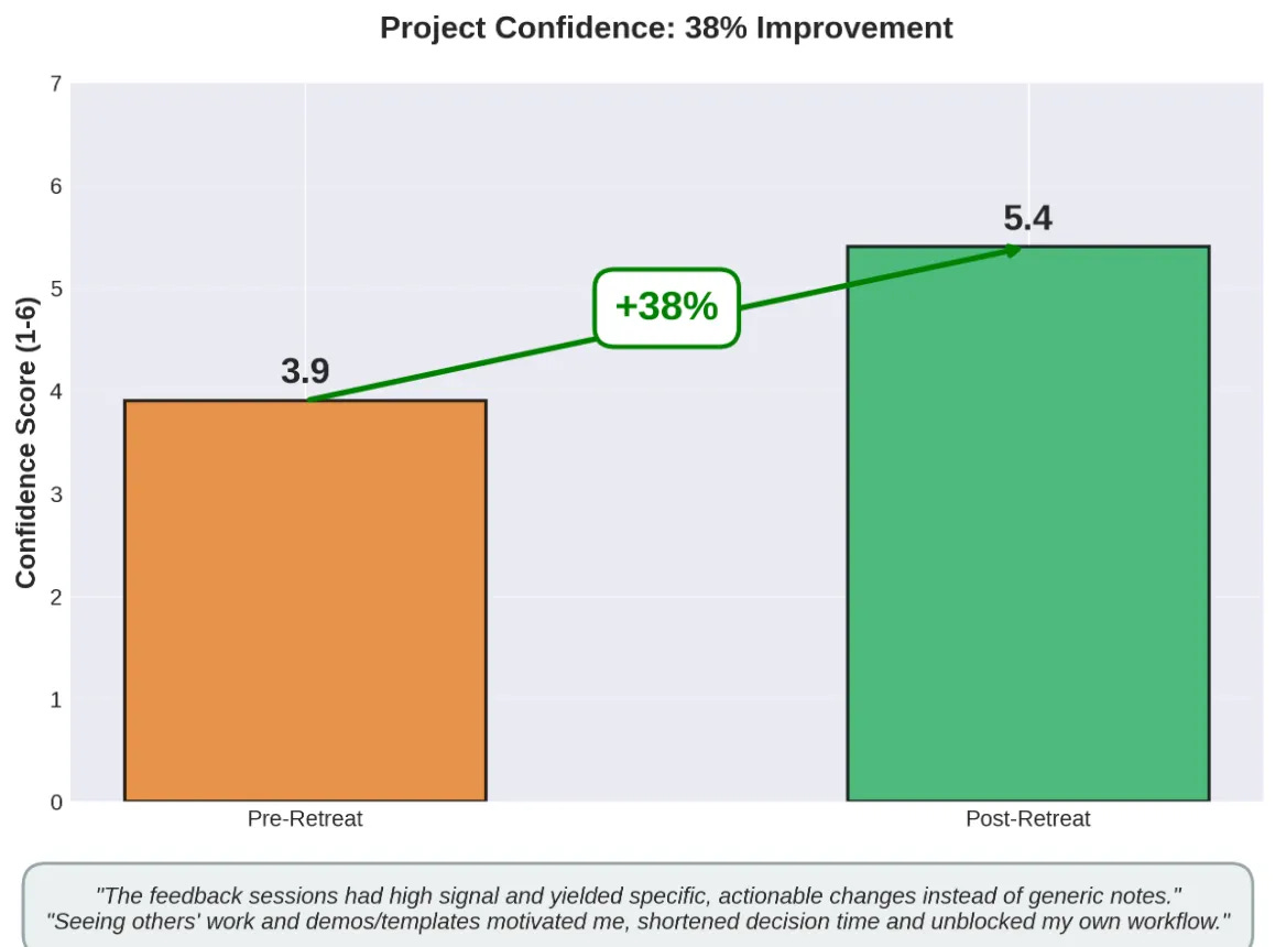 The container (the accountability, the structure, the dedicated time/space to focus) along with the network (access to expert peers, serendipitous feedback, learning from others) seemed to contribute the most to meaningful experiences in the team.